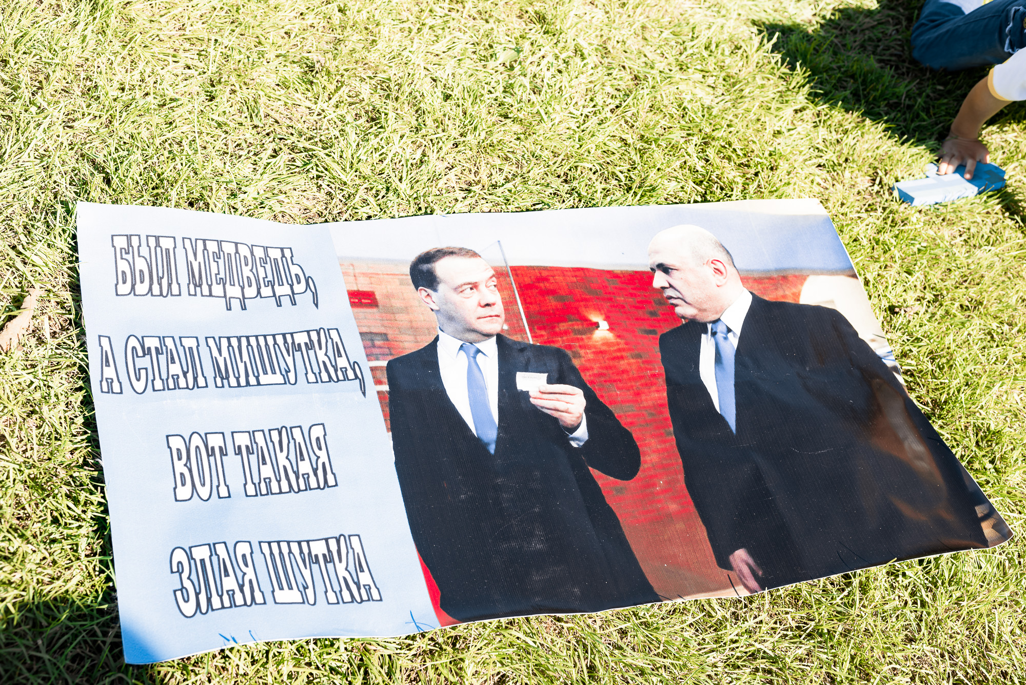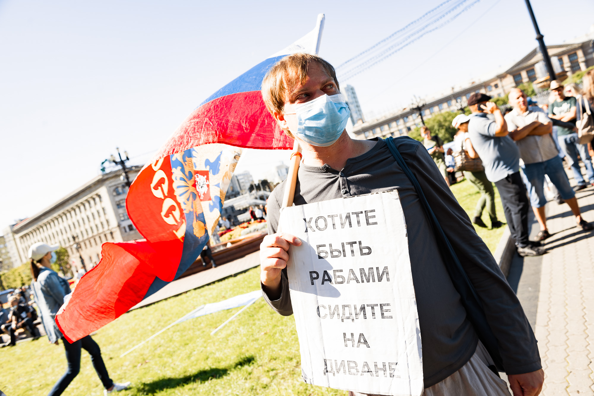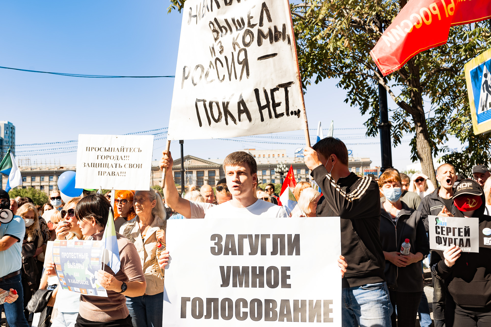 "Путин – вор", "ЕдРо – помойное ведро", "Путин, выпей чаю, Хабаровск угощает", "Долой путинский беспредел", "Двадцать лет – доверия нет" – эти кричалки и транспаранты уже стали визитной карточкой субботних митингов. Не забыли о них и сегодня, в десятую протестную субботу.