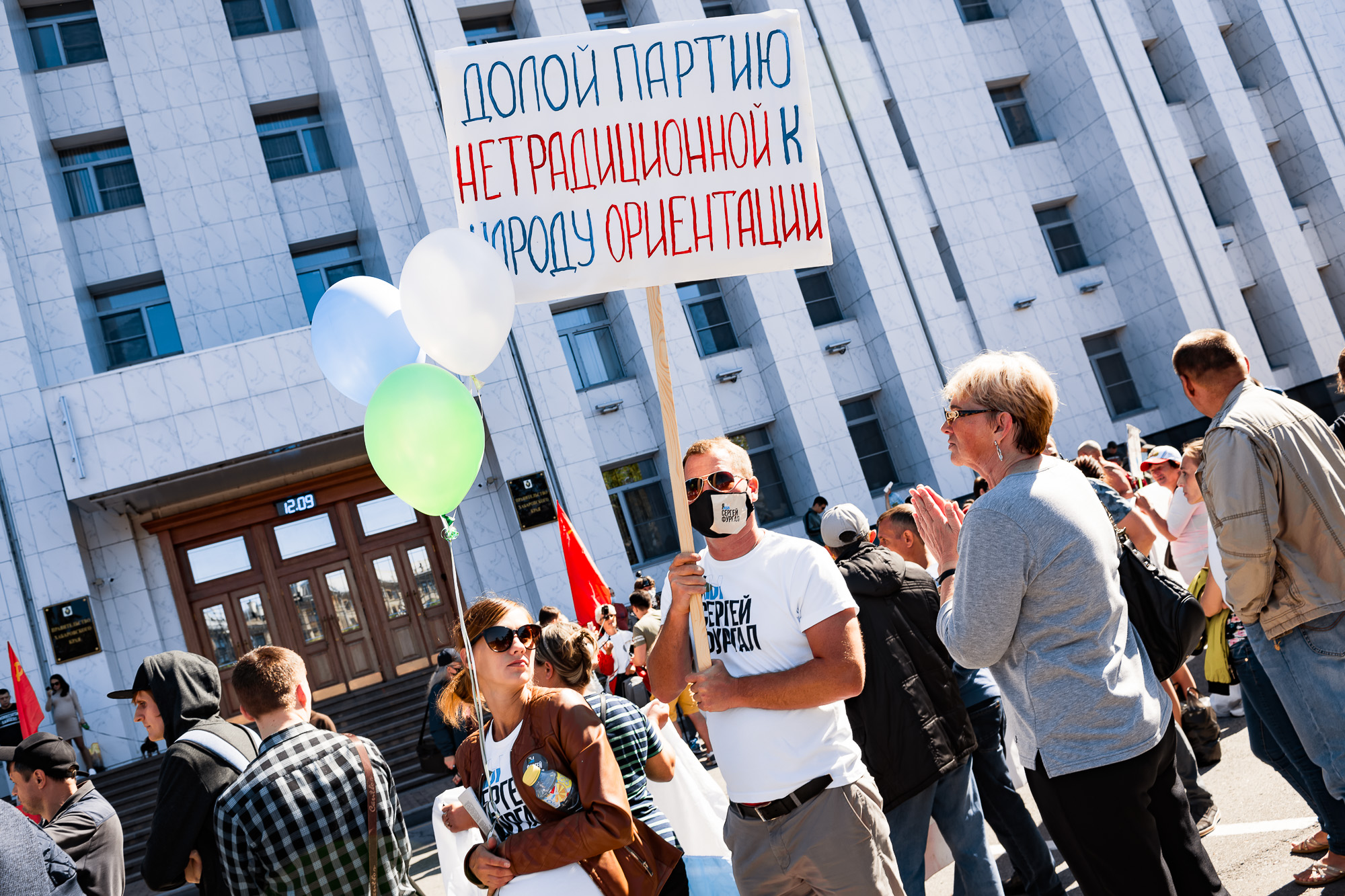 Все акции в Хабаровске обходятся без беспорядков, до драк, конфликтов, противозаконных действий ни разу не доходило. Протестующие сами быстро вычисляют провокаторов. Правда, если раньше провокаторами считали всех, кто начинал выкрикивать антипутинские лозунги, то теперь их подхватывает почти вся колонна.