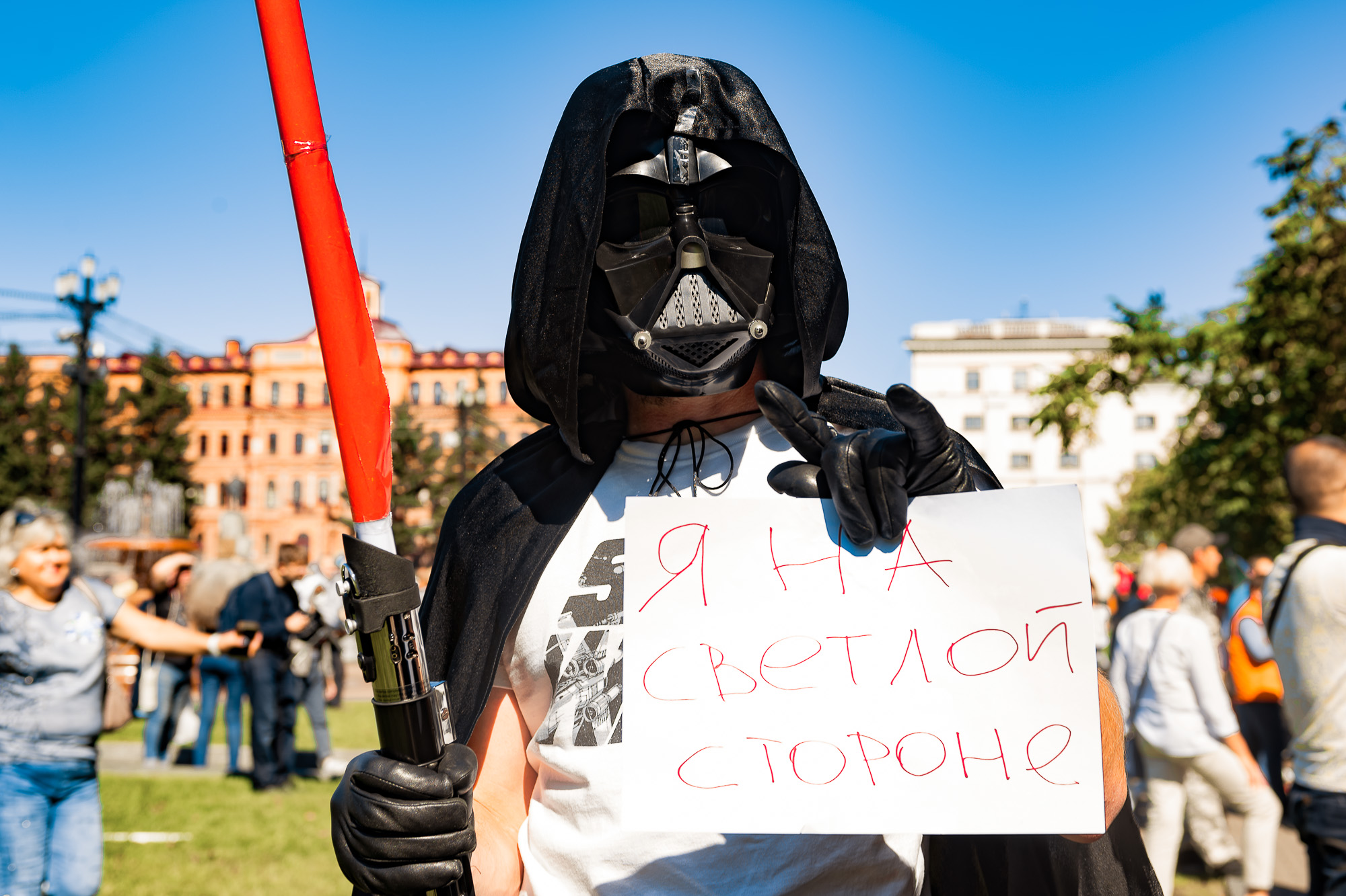 – Я буду выходить, пока не освободят Фургала. Они ведь его точно освободят, выбора у них другого нет, – замечает Лорд Вейдер, размахивая световым мечом. В руках у него табличка "Я на светлой стороне". – А Путин, он же боится мятежников. Да и не то что с людьми разговаривать – он вообще ничего уже не может. Протесты уже сильно повлияли на Россию. Но я-то тут мало кого знаю, я же с другой планеты.