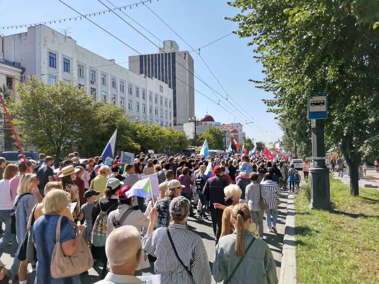 Между тем уже вторую субботу подряд полиция не стоит в оцеплении перед крыльцом здания правительства Хабаровского края, возле которого и проходит митинг. По ходу шествия сотрудников тоже не так много – митингующих встречает экипаж ДПС только по пути шествия на Комсомольской площади.