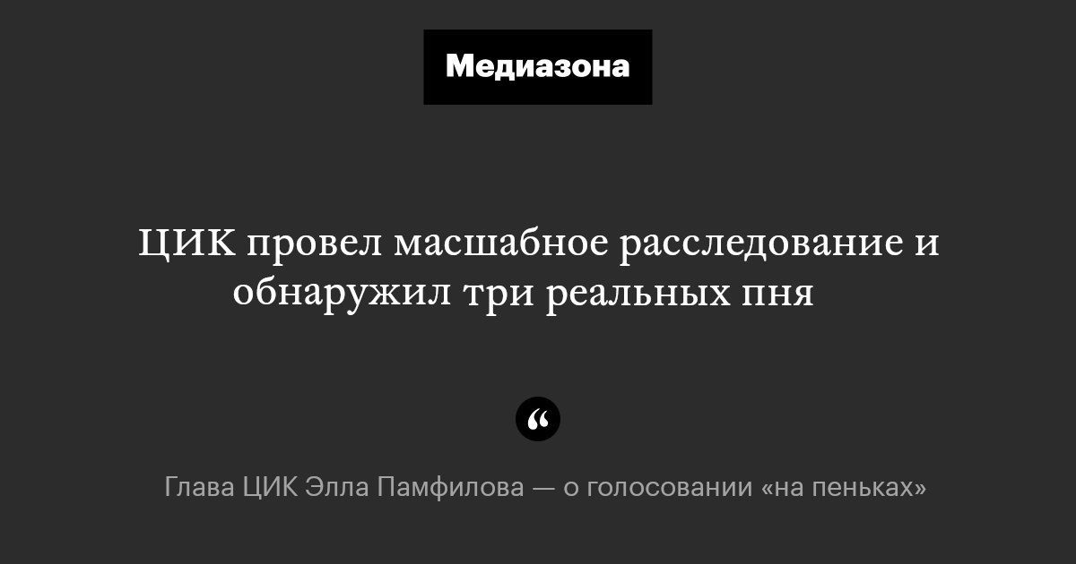 «ЦИК России провела масштабное расследование и обнаружила три реальных пня, которые были задействованы в голосовании летом текущего года», — сказала Памфилова на пресс-конференции.