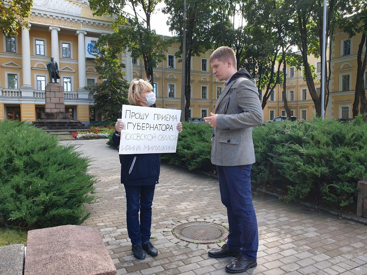 Ежедневные пикеты в поддержку активистов Милушкиных начались 14 июня 2019 года, когда на митинге за отставку губернатора Псковской области Михаила Ведерникова Ирина Милушкина развернула плакат "Свободу Артему Милушкину, 5 месяцев в СИЗО". Полицейские потребовали убрать его "ввиду несоответствия заявленным целям акции", а мать активиста в этот же день встала у здания регионального УМВД. Ежедневные пикеты длились несколько месяцев и прекратились в конце 2019 года. В 2020 году Ирина Милушкина сообщала, что не может выйти на пикеты в поддержку сына из-за ограничений по коронавирусу.