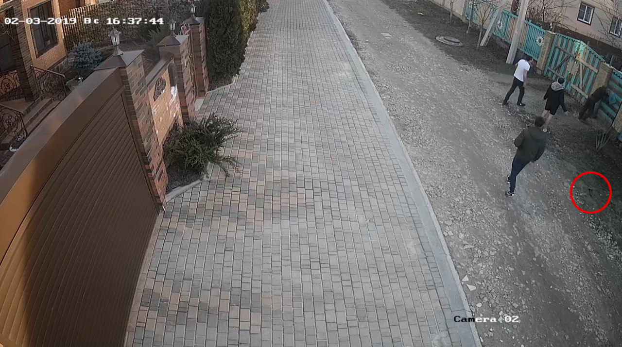 Фрагмент записи с камеры видеонаблюдения: Артемов-старший, отбросив молоток (обведен красным), захлопнул калитку Хоменко снаружи