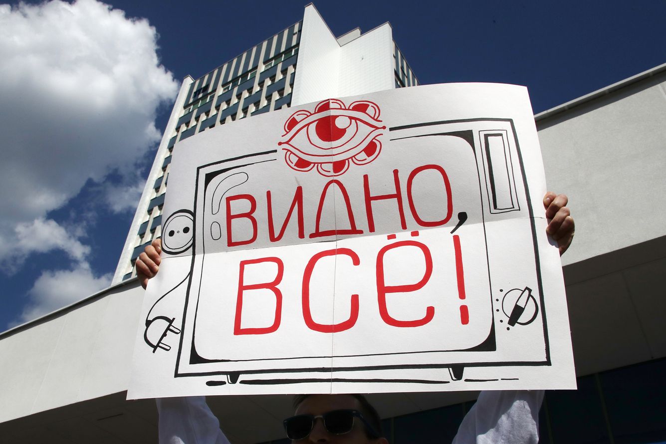 Valery Sharifulin / TASS / Scanpix / LETA Workers on strike outside Belteleradio’s headquarters in Minsk on August 17, 2020. Sign reads: “Always watching!”