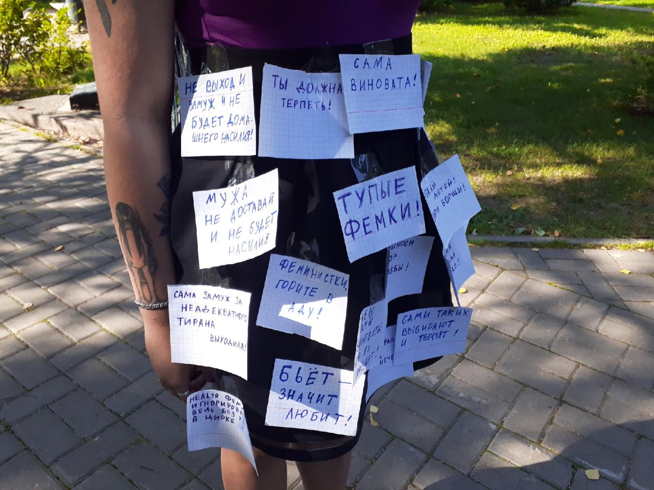 "Я простояла так всего несколько минут. На улице был сильный ветер, и стикеры начали отклеиваться", – отмечает Невская. По ее словам, прохожие реагировали скорее с интересом. Прямой агрессии не было. Ей кажется, что так открыто оскорблять других люди готовы только в сети. "Как женщина я сейчас чувствую себя гораздо менее уязвимой, – добавляет активистка. – Все-таки я не испугалась и смогла открыто высказать свою позицию".