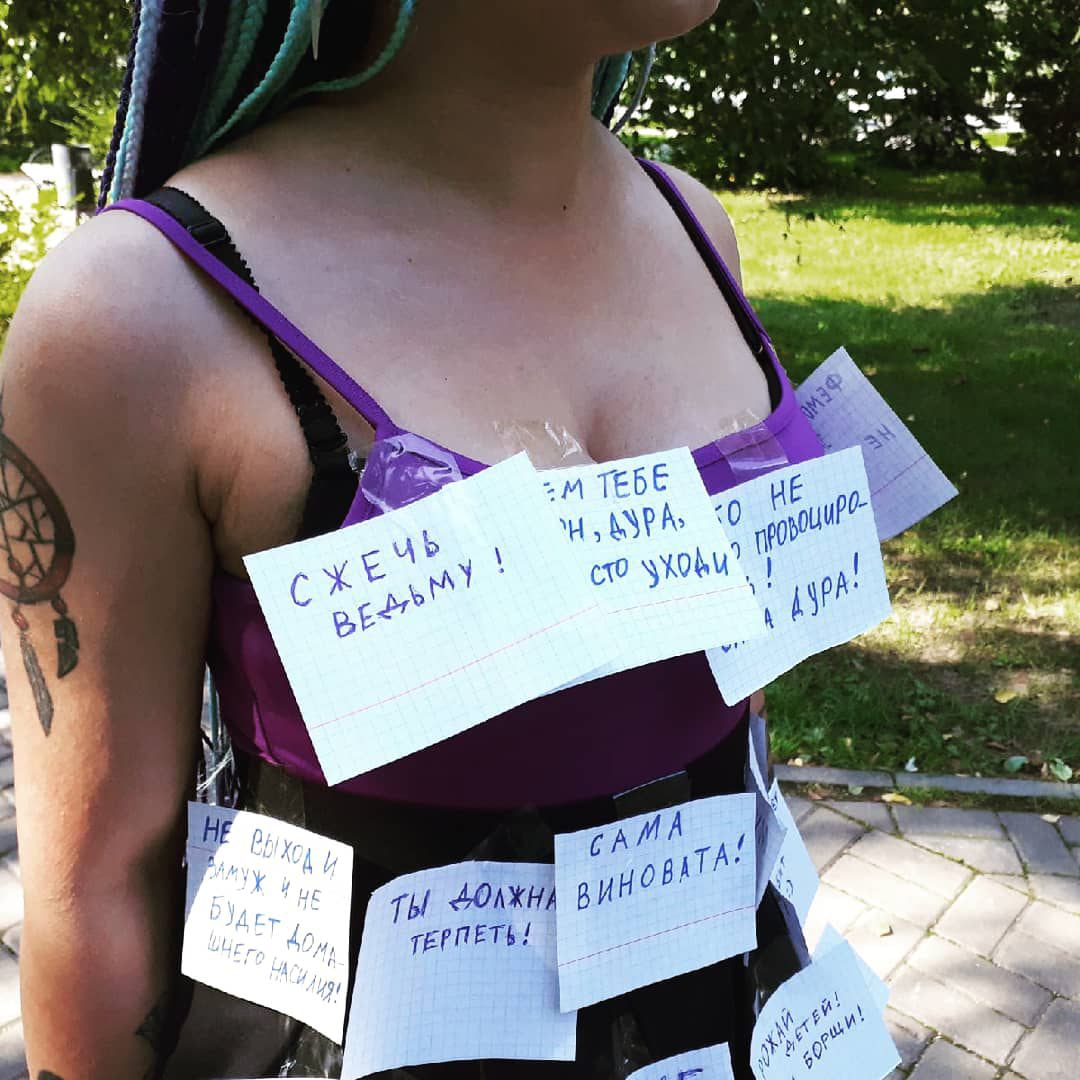 Когда шквал агрессии закончился, активистка решила, что хочет ответить на все обидные высказывания. 25 августа она вышла с новой акцией. Свое тело она обклеила стикерами, на которых написала все неприятные комментарии, полученные в свой адрес после первого выхода на площадь: "Сжечь ведьму", "Тупые фемки", "Ты должна терпеть", "Сама замуж за неадекватного тирана выходила".