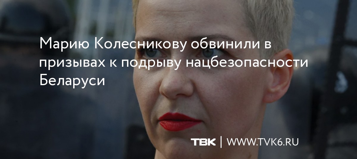 «Следователи сегодня предъявили Марии Колесниковой обвинение по части 3 статьи 361 (призывы к действиям, направленным на причинение вреда национальной безопасности Республики Беларусь, совершенные с использованием СМИ и сети Интернет) Уголовного кодекса Республики Беларусь», – говорится в сообщении, опубликованном в Telegram-канале СК.