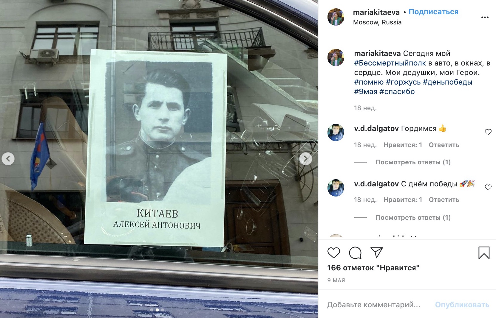 Китаева участвовала в акции «Бессмертный полк» и разместила портреты своих дедов в окнах квартиры, а также на боковых стеклах автомобиля изнутри. Разглядывая отражения в этих стеклах, корреспонденты «Медиазоны» предположили, что советница Минобороны живет в клубном доме на улице Бурденко.