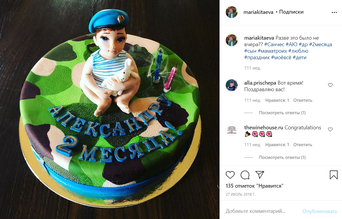 В июле 2018 года появилась фотография торта с фигуркой ребенка в тельняшке и в голубом берете ВДВ. Бабушка младенца Нина Китаева оставила комментарий: «Машуля, поздравляем вас, Александра Юрьевича с чудной датой — два месяца! Растет отличный парнишка!».