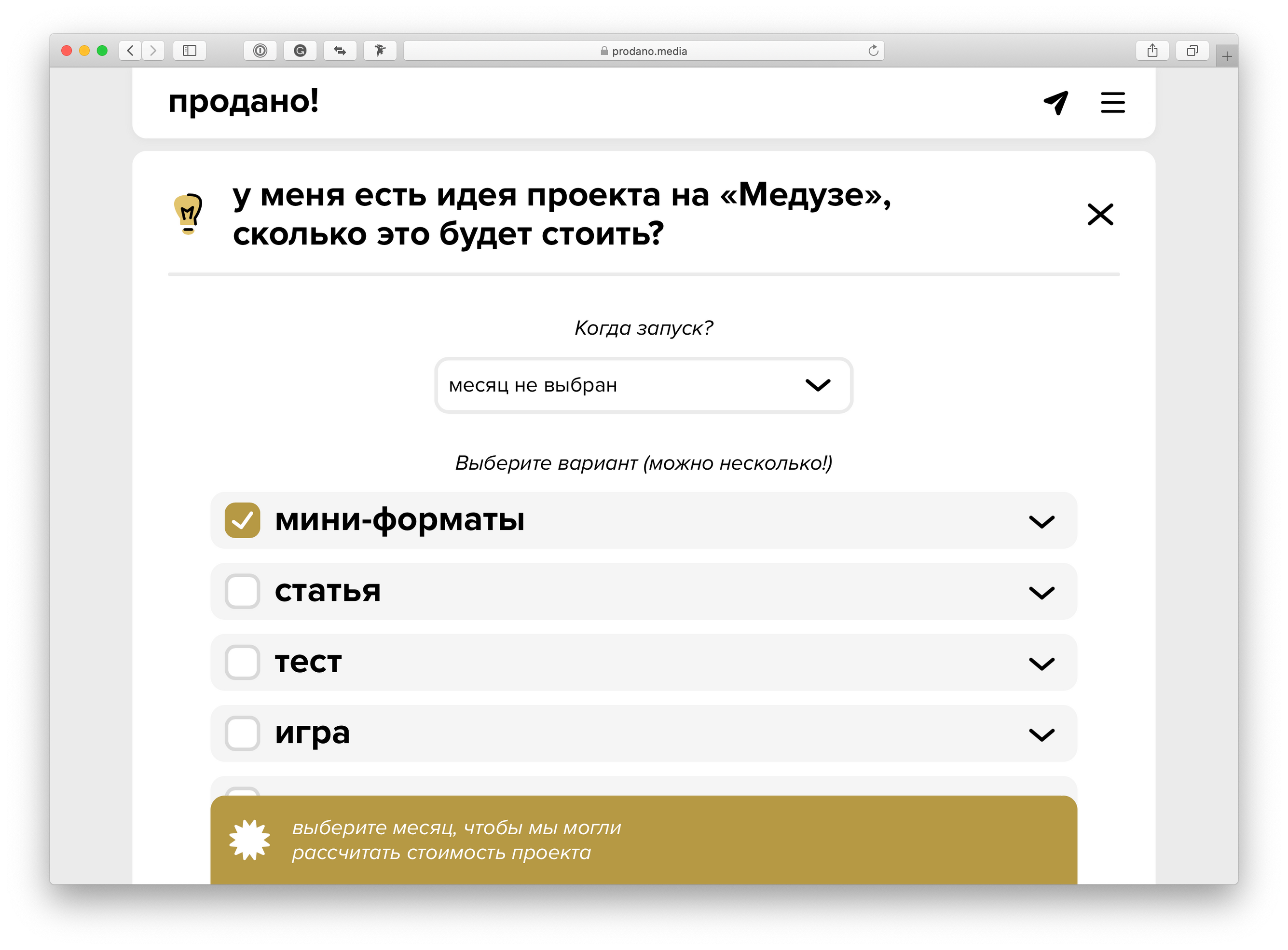Короткая версия. Мы сделали сайт про рекламные форматы на «Медузе», где можно сразу посчитать стоимость проекта. Вот он: prodano.media