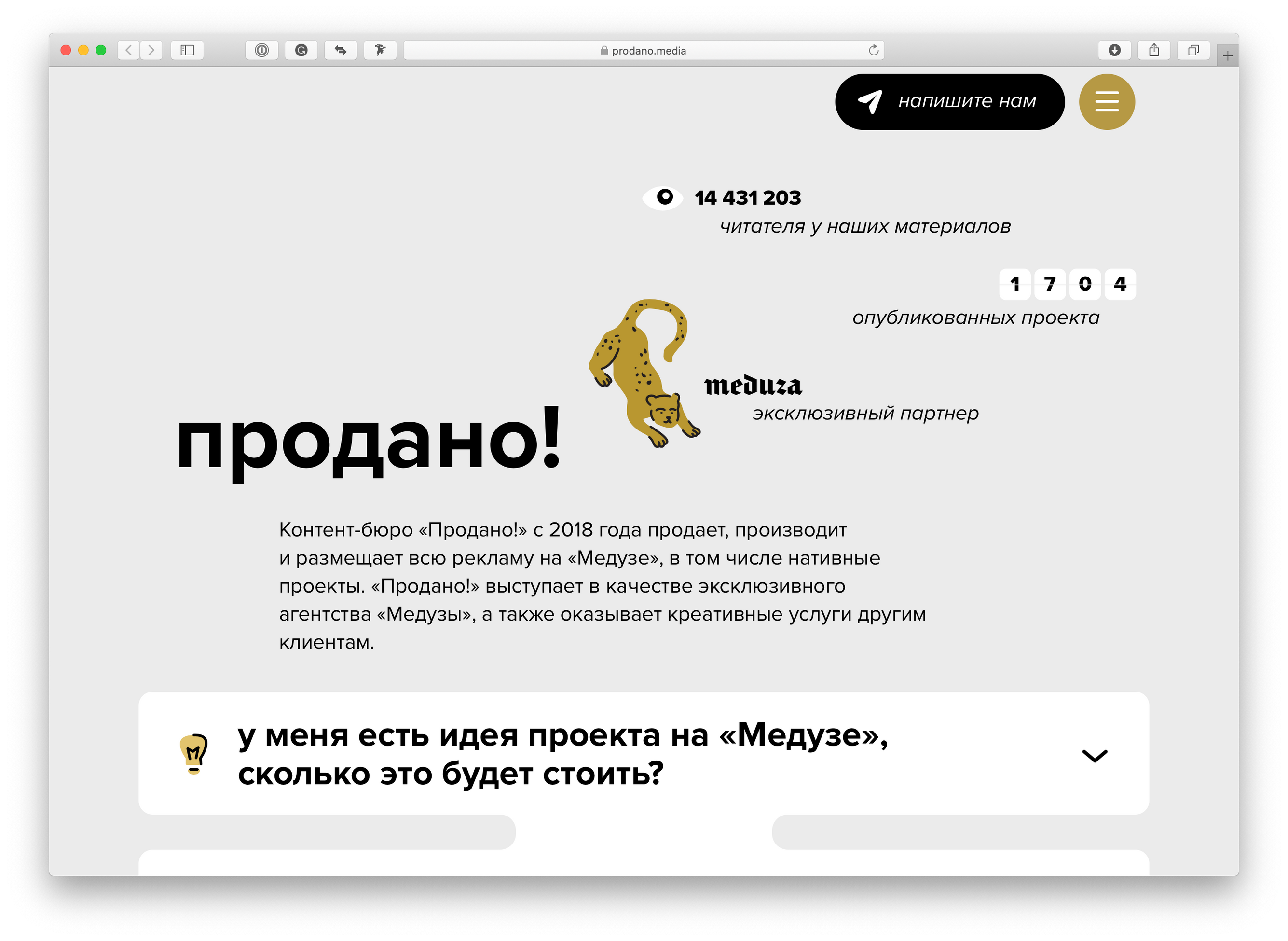 В начале 2019 года рекламный отдел «Медузы» стал самостоятельной, независимой компанией — назвать ее решили коротко и эмоционально: «Продано!» Это одновременно и контент-бюро, и рекламное агентство, которое эксклюзивно продает и делает всю рекламу на «Медузе»: от баннеров и интеграций в подкасты до партнерских игр и брендированных масок в инстаграме. «Продано!» полностью взяло на себя коммерческие функции, окончательно оградив редакцию от чуждого ей мира брифов и согласований.