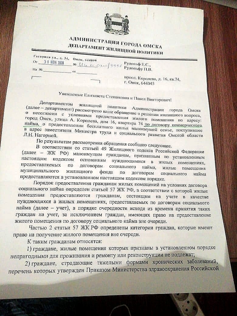 "В марте 2001 года сына поставили в льготную очередь на получение жилья под номером 10. С тех пор прошло почти 20 лет, а квартиру он так и не получил. Зато его стали постоянно отодвигать в очередности. И вышло, что в 2020 году в общей очереди Павел числится 10139-м, а в списке первоочередников – 4368-м. Этот ответ нам прислали из департамента жилищной политики Омска в июне 2020 года", – рассказывает Елизавета.