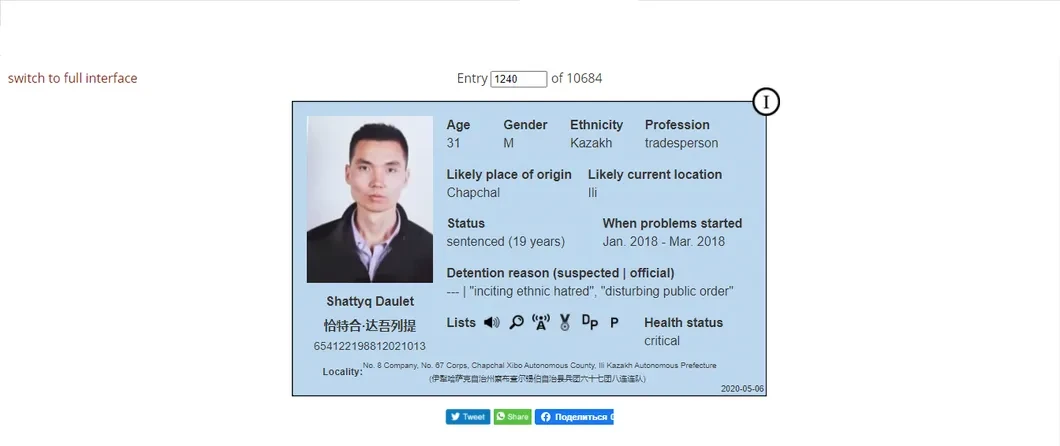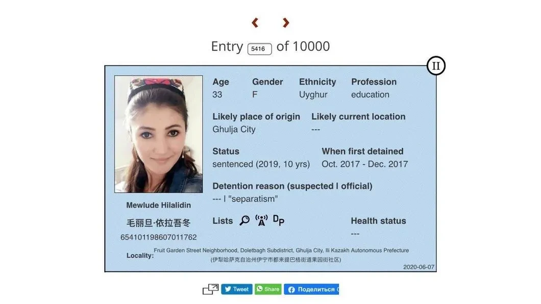 — Это база данных Shahit.biz. «Шахит» с уйгурского — «свидетель». Мы документируем свидетельства о жертвах китайской «политики перевоспитания». Делаем это подробно и открыто, чтобы люди могли узнать о них и чтобы китайские власти знали — мы следим.