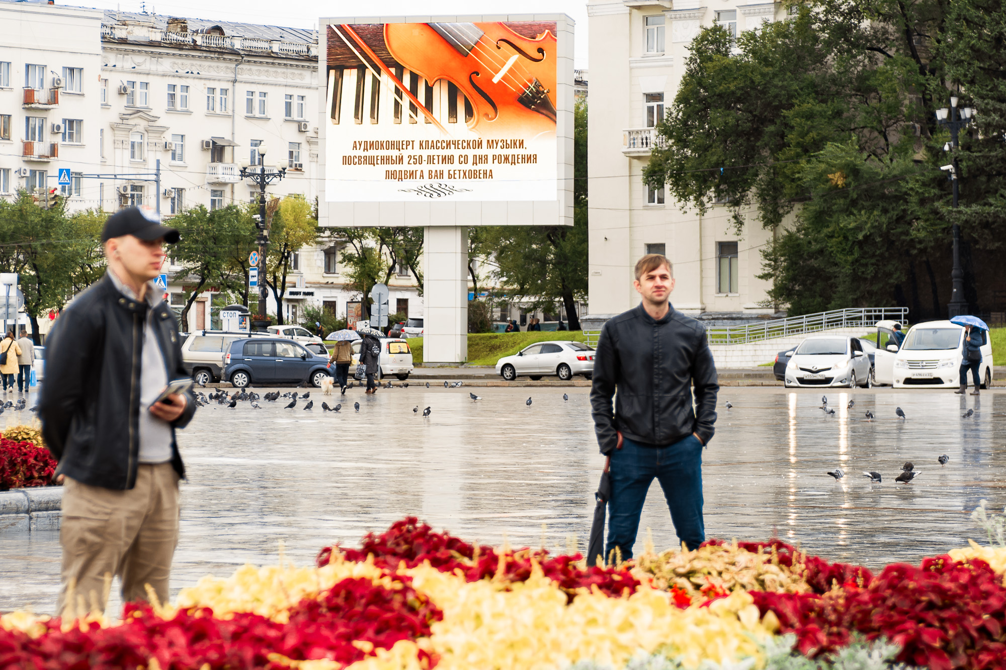 В Хабаровске сегодня по-осеннему прохладно и сыро, моросит дождь. И, тем не менее, как всегда по субботам, в полдень люди собрались на площади Ленина. Полицейских снова было практически не видно, но сегодня власти решили помешать протестующим по-новому: на всю площадь из динамиков играли симфонии Бетховена. Концерт, как анонсировали из громкоговорителей, посвящен 250-летию со дня рождения великого композитора: мэрию не смутил даже тот факт, что он родился 16 декабря.