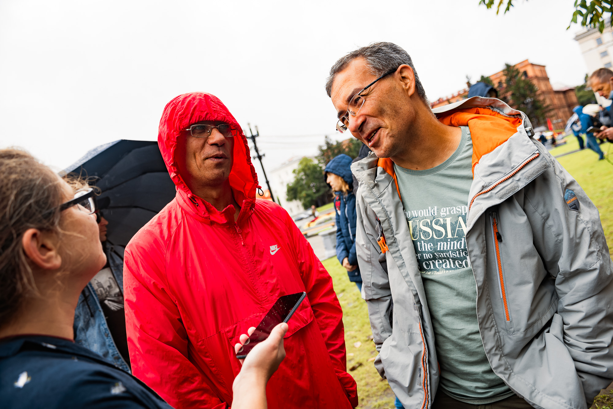 – Извините, ничего не слышу! – пытались общаться между собой протестующие. Но подмога пришла быстро – у хабаровчан есть уже несколько мегафонов, на которые жители скинулись сами, у некоторых имеются даже небольшие микрофоны на батарейках с встроенным динамиком.