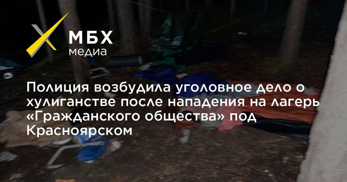Полиция возбудила уголовное дело по ч. 2 ст. 213 УК (хулиганство, совершенное группой лиц по предварительному сговору) после нападения неизвестных на лагерь активистов «Гражданского общества» под Красноярском, сообщает управление МВД по региону.