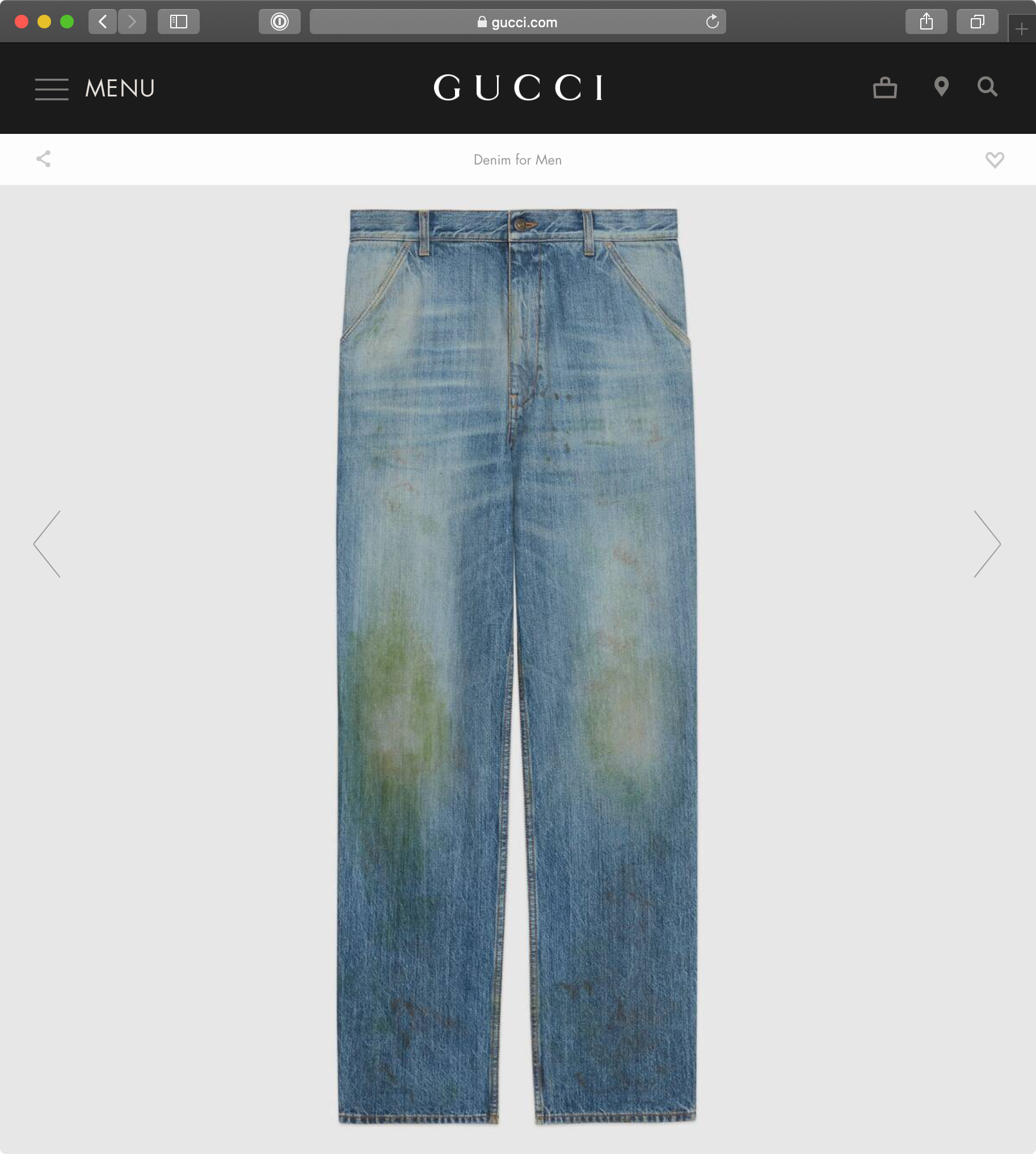 Итальянский модный дом Gucci выпустил джинсы с пятнами от травы в области колен и ягодиц. Это часть мужской коллекции сезона осень-зима 2020/21. Джинсы из этой коллекции можно купить за 600 фунтов стерлингов — это примерно 58,5 тысяч рублей.