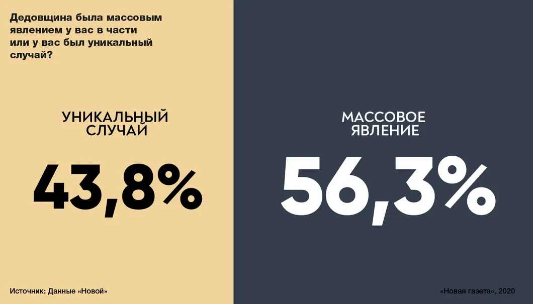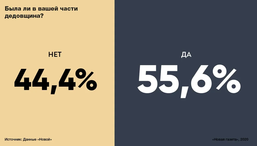 Как следует из опроса, проведенного на сайте «Новой газеты» в сентябре, среди респондентов, проходивших военную службу в России в последние шесть лет (самый ранний год призыва опрошенных — 2014-й, а самый поздний — 2020-й), большинство сталкивалось с дедовщиной во время службы.