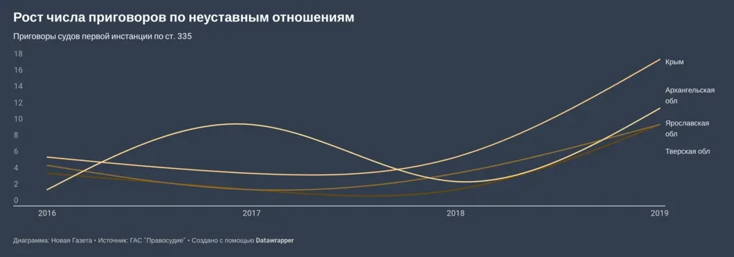 Например, в Крыму в 2018 году было вынесено 6 приговоров за неуставные отношения, но уже в 2019 году их было в 3 раза больше — 18. Значительное увеличение заметно в Ярославской (с 4 до 10 приговоров), Тверской (с 2 до 10) и Архангельской областях (с 3 приговоров в 2018 году до 12 в 2019 году). Судили в последние годы и военнослужащих Российской армии в частях за пределами России. С 2016 по 2019 год военные суды ежегодно выносили от 5 до 7 приговоров по статье за неуставные отношения российским военным, дислоцированным в Армении, Таджикистане и Казахстане. Всего за этот период гарнизонные суды вынесли 24 таких приговора.