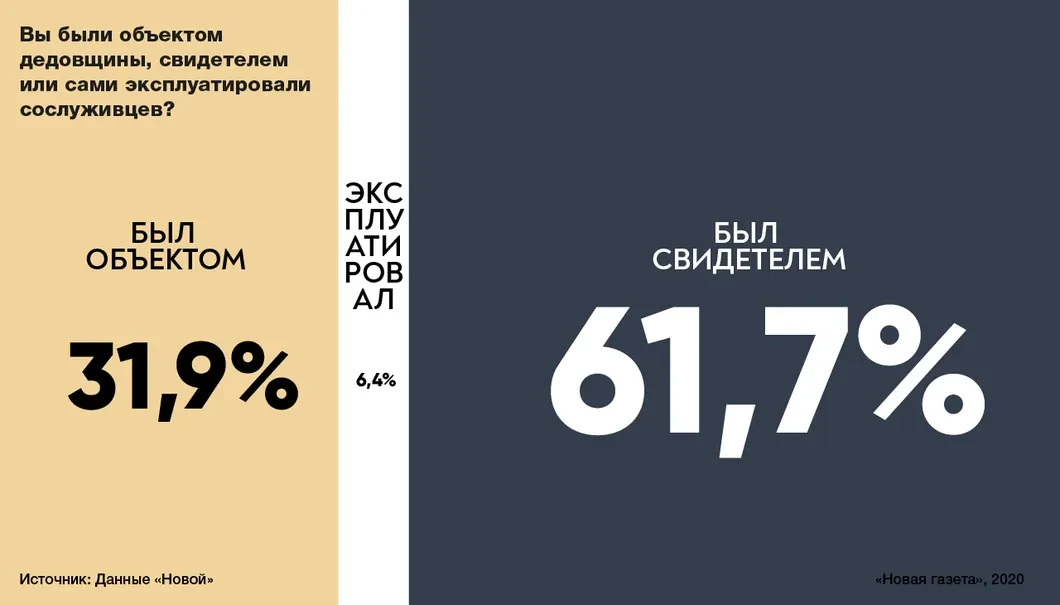 Как следует из опроса, проведенного на сайте «Новой газеты», в большинстве случаев молодые люди становятся свидетелями эпизодов дедовщины, иногда — объектом и только изредка сознаются в том, что сами эксплуатировали сослуживцев.