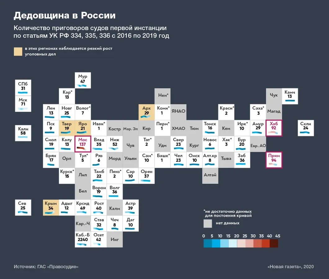 Из данных государственной системы «Правосудие», изученной «Новой», следует, что только по статье «нарушение уставных правил взаимоотношений между военнослужащими при отсутствии между ними отношений подчиненности» суды первой инстанции с 2016 года по сентябрь 2020-го рассмотрели 1268 дел. Еще 292 уголовных дела — по статьям 334 и 336 УК РФ. Около трети (28%) от общего числа дел прекращено из-за того, что суд назначал по делу штраф, ссылаясь на то, что преступление небольшой или средней тяжести, совершено впервые, а обвиняемый возместил ущерб. Большинство приговоров за эти годы вынесено в Московской области, Приморском и Хабаровском краях.