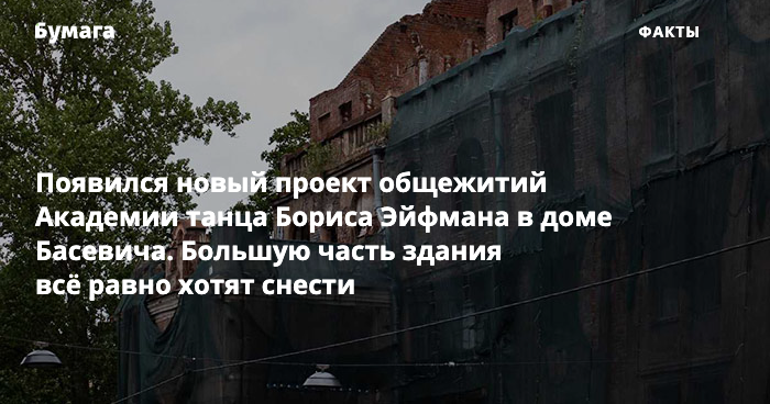 В Петербурге продолжается кампания в защиту дома Басевича на Большой Пушкарской, 7. Здание начала XX века собираются частично снести и воссоздать для нужд интерната и общежития Академии танца Бориса Эйфмана.