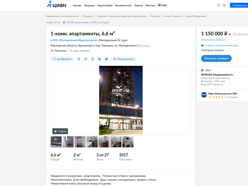 В Красногорске продают шикарные апартаменты площадью 6.6 кв.м. И всего за 1 150 000 рублей.