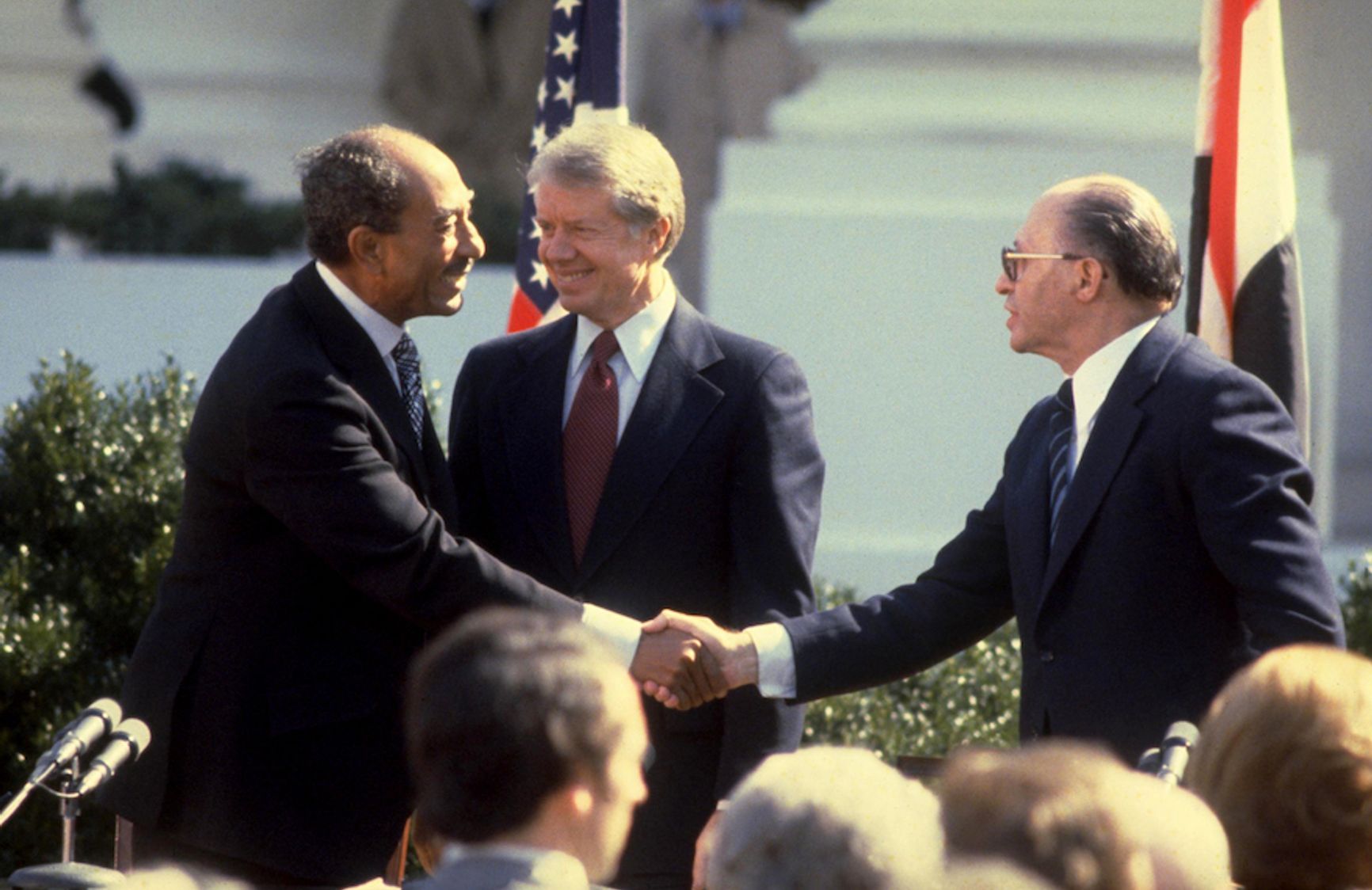Президент США Джимми Картер, лидер Египта Анвар Садат и Израиля Менахем Бегин после подписания Кэмп-Дэвидского соглашения 26 марта 1979 года году
