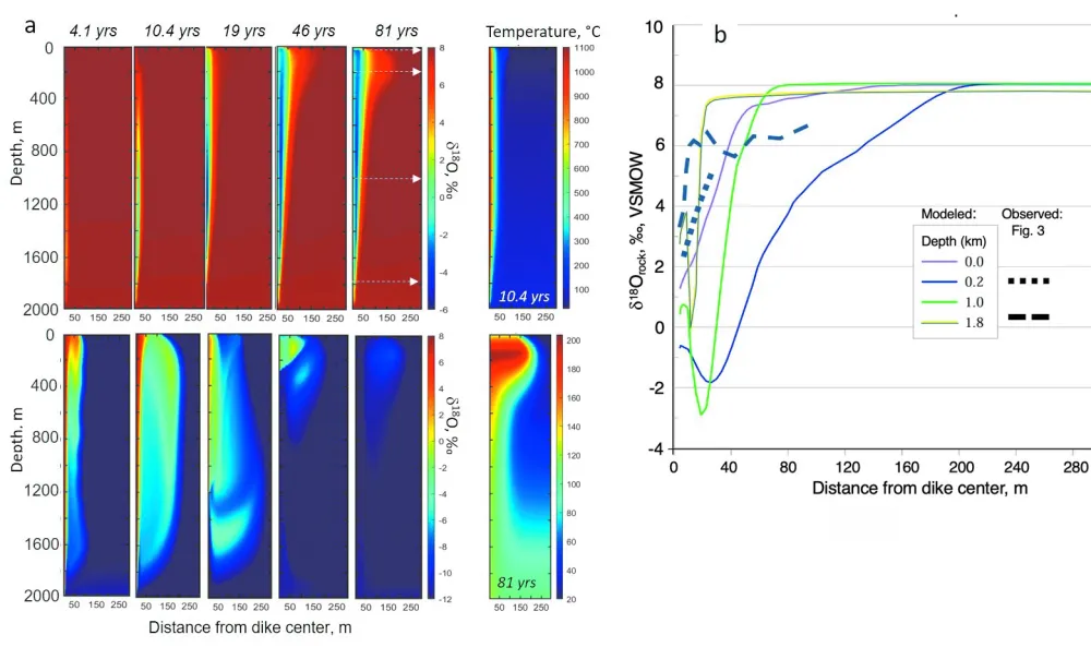 Анализ образцов показал, что вокруг больших даек (трещин, заполненных магматическим расплавом) образуются области прогрева до 100 м шириной, причем самые «легкие» по кислороду породы сосредоточены на их границах, а вдали от даек изотопное отношение выходит на невозмущенный уровень. Это значит, что течение магмы в трещине вызвало прогрев водонасыщенных пород, конвекцию воды и ее изотопный обмен.