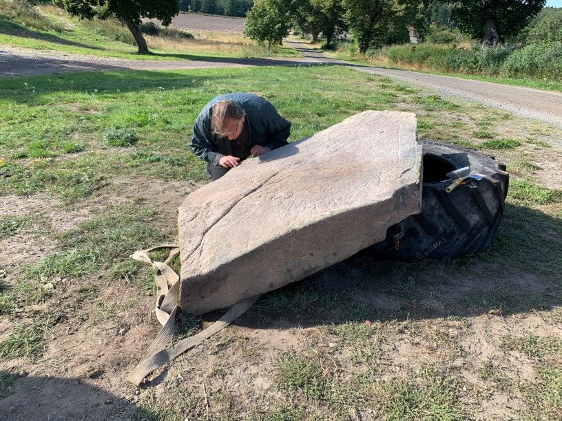 Ларссон выворотил камень из земли еще несколько лет назад, но тогда не увидел в нем ничего примечательного. Он подумал, что большой плоский камень (примерно два метра на метр) может пригодиться в будущем, и оставил его лежать на краю поля. Недавно Лассон решил использовать камень для строительных работ и, подняв его при помощи экскаватора, заметил вырезанные на нижней поверхности руны.
