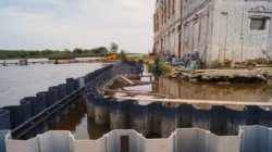 "Лагерь поставили, три бытовки, сделали пирс, ледорезы поставили", – перечисляет Пономарев все, что они сделали за два года. Но самое главное – построили шпунтовую стенку, чтобы полностью отсечь воду от храма. Позже с внутренней стороны ее зальют бетоном, а сверху постелют деревянные мостки. "Сюда будут маленькие лодочки причаливать", – говорит Михаил. Как закончат с берегом, займутся фундаментом самой церкви.