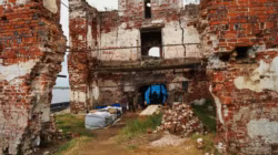 У Елены примерно полчаса, и не теряя время она идет осматривать руины. Начала с наклонившейся колокольни. На время работ в основании башни организовали кухню для волонтеров и рабочих. От средней части храма мало что осталось, с трудом можно понять, где здесь был алтарь. А вместо иконостаса – написанные красной краской имена. Возможно, белозерских подростков, которые когда-то добрались до острова.