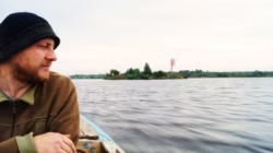 По реке Шексне разносится шум мотора. Работники и волонтеры консервации храма Крохино смотрят на проплывающую мимо острова лодку. Она огибает маленький остров и причаливает к деревянному пирсу.