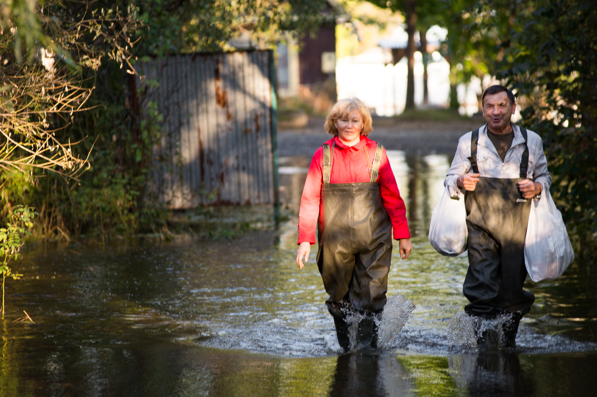 На трассе Хабаровск – Чита практически не осталось сухих мест – зеленевшие здесь поля почти везде затопило. Но ближе к протокам Амура ситуация еще хуже. Немногочисленные жители Владимировки в Еврейской автономной области около трех недель предпочитают оставлять свои машины на обочине дороги к селу, а самая актуальная одежда – рыбацкие бродни – резиновые комбинезоны.