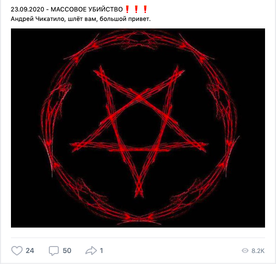 Поводом стал пост, который появился на странице Куценко во «ВКонтакте» еще за три дня до этого — 20 сентября: картинка с красной пятиконечной звездой в круге на черном фоне и : «23.09.2020 — МАССОВОЕ УБИЙСТВО Андрей Чикатило, шлет вам, большой привет».
