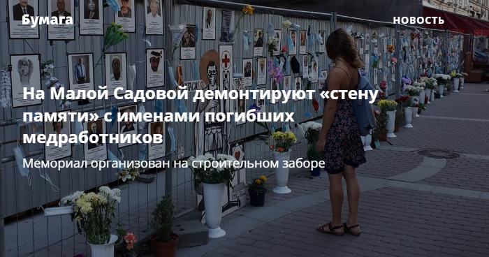 25 сентября на Малой Садовой улице в Петербурге демонтируют «стену памяти» с именами медработников, которые погибли во время пандемии коронавируса. Об этом сообщила создательница неофициального мемориала Ирина Маслова.