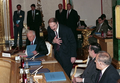 2. 21.10.1994. Россия. Москва. 21 октября 1994 г. Президент Белоруссии А. Лукашенко (в центре) принимает поздравления в связи с избранием его президентом республики. Президент Грузии Э. Шеварднадзе - слева. Сенцов Александр, Чумичев Александр/Фотохроника ТАСС
