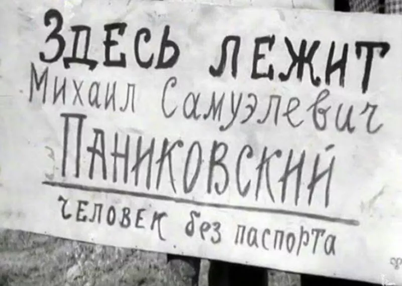 Паниковский умер. Его похоронили в «естественной яме», и «при спичечных вспышках великий комбинатор вывел на плите куском кирпича эпитафию: „Здесь лежит Михаил Самуэлевич Паниковский, человек без паспорта”». Эта эпитафия знакома советским и постсоветским читателям с детства. Но что она на самом деле означает?