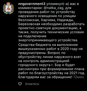 Жители обращались также с жалобой в блог губернатора, в котором им дан ответ, что средства бюджета на выполнение работ в 2020 году не предусмотрены. Но опрос будет рассмотрен при формировании плана работ по благоустройству на 2021 год.