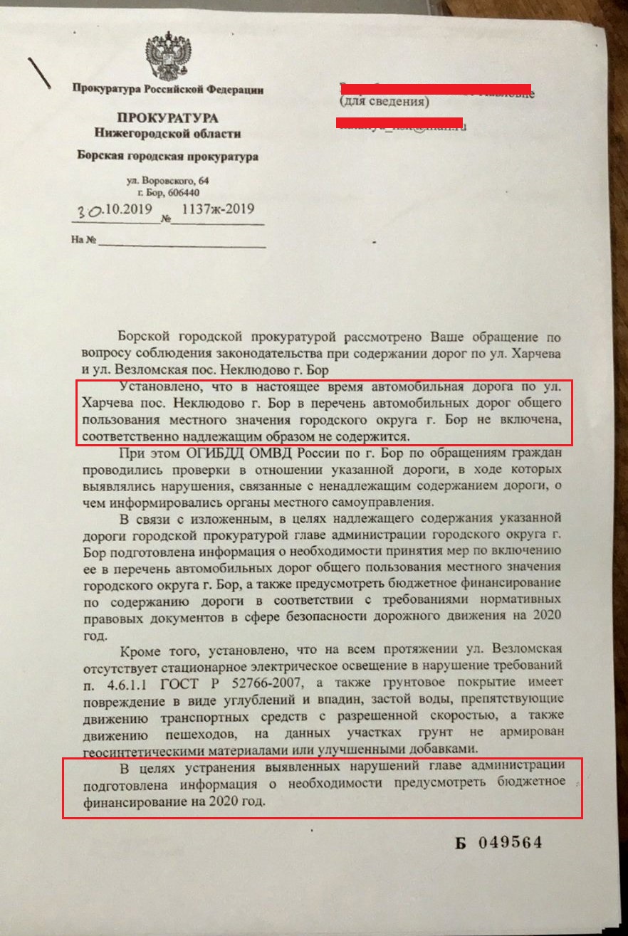 Между тем в 2019 году граждане уже жаловались в Борскую прокуратуру, добиваясь обеспечения безопасности для пешеходов поселка Неклюдово. Подтвердив наличие нарушений законодательства, прокуратура обнадежила заявителей, что для обеспечения нормативного состояния территории «главе администрации подготовлена информация о необходимости предусмотреть бюджетное финансирование на 2020 год». Что никак не повлияло на ситуацию.