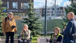 Во время заседания у суда стояли люди из группы поддержки Дмитриева. Историк Анатолий Разумов давал интервью, он показал журналисту плакат, с которым выходил на акцию поддержки историка. За это его задержали.