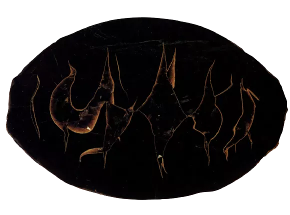 Чтобы лучше прояснить отношения между искусством и эстетикой, Кайуа предлагает проделать по отношению к камням ту же операцию, какую уже совершила современная ему живопись, — отказаться в рассмотрении камней от такого критерия, как образность. Но как тогда оценивать эту принципиально неформализованную материю? В таких обстоятельствах, если требуется какой-нибудь природный объект, какой-нибудь камень, который можно сравнить с нефигуративной картиной, нужно искать не возможное сходство, а эквивалент пластических эффектов без отсылки к формам видимой вселенной. Итак, чтобы сопоставить работы, представляющие новый стиль искусства, нужен новый вид минерала, на котором есть рубцы, далекие от геометрии мрамора и агата, — иероглифы без сообщений, которые не пробуждают никаких воспоминаний. Таковы камни, известные как септарии.