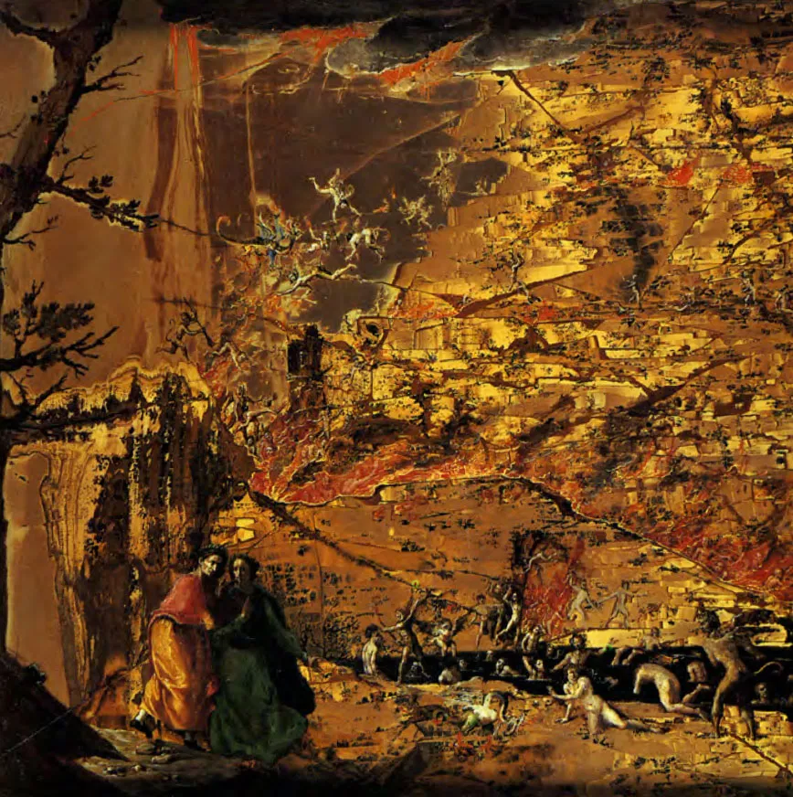 ример, одна из таких работ неизвестного автора была вдохновлена «Божественной комедией» Данте; она изображает посещение ада Данте и Вергилием: красное пламя вырывается на темном охристом фоне, изборожденном черными прожилками и испещренном бледными пятнами — обнаженными телами проклятых. Это случай явного соответствия между подземными чертогами ада и происхождением камня, который сам был добыт из глубин земли и когда-то пропекался в жаре нечеловеческой печи. Любопытно, что в данном случае использование экзотического материала больше не является прихотью художника: вместо этого имеют место особые отношения между сюжетом и медиумом, который его выражает. Кайуа комментирует это следующим образом: