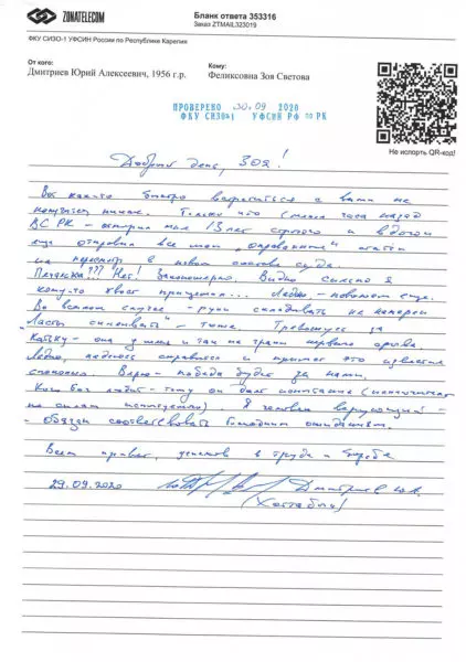 На следующий день после ужесточения приговора историку Юрию Дмитриеву (с 3,5 лет до 13-ти) обозреватель «МБХ медиа» Зоя Светова получила от него письмо. Мы публикуем это письмо, интервью Зои Световой с адвокатом Дмитриева Виктором Ануфриевым и комментарий члена правления Международного Общества «Мемориал» Сергея Кривенко.