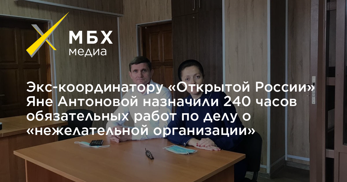 Ленинский районный суд Краснодара назначил 240 часов обязательных работ бывшему координатору «Открытой России» Яне Антоновой по уголовному делу об участии в деятельности «нежелательной организации» (статья 284.1 УК). Об этом сообщил «МБХ медиа» координатор «Правозащиты Открытки» Алексей Прянишников.
