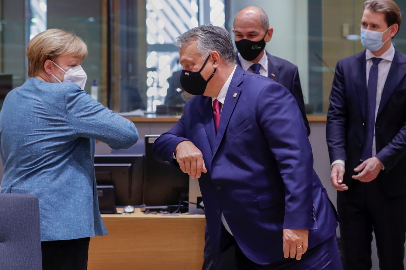 Olivier Hoslet / Pool / AP / Scanpix / LETA Канцлер Германии Ангела Меркель и премьер-министр Венгрии Виктор Орбан перед началом саммита ЕС. 1 октября 2020 года