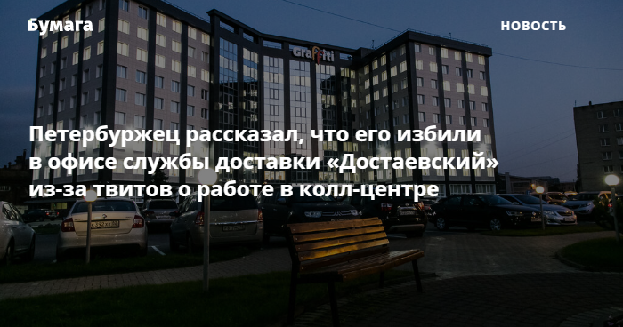 Петербуржец Андрей Терашкевич заявил, что его избили в офисе службы доставки «Достаевский» после отказа удалять твиты о минусах работы в колл-центре компании.