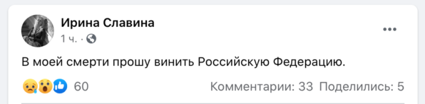В последнем посте в фейсбуке Славина попросила «в её смерти винить Российскую Федерацию».