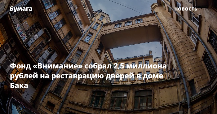 Фонд сохранения исторического наследия «Внимание» собрал 2,5 миллиона рублей на реставрацию дома Бака на Кирочной улице. Об этом сообщается в соцсетях организации.
