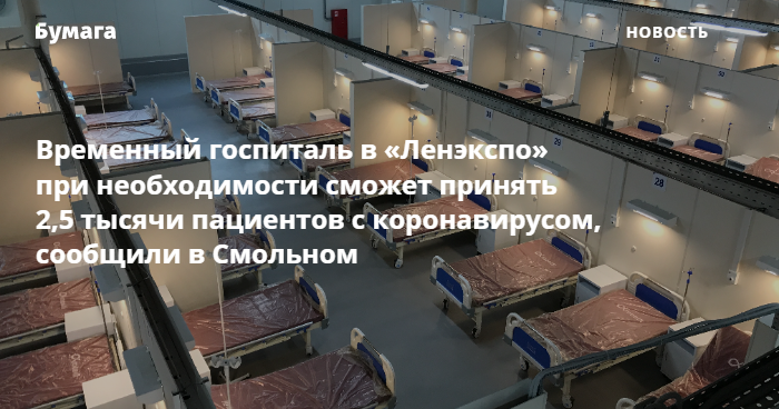 Временный госпиталь в «Ленэкспо» готов к эксплуатации и при необходимости сможет принять порядка 2,5 тысячи пациентов с коронавирусом. Об этом сообщает пресс-служба администрации города.